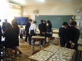 2月25日(水) 本日は、3年生が県立高等学校入学者選抜の学力検査に臨みました。 当日は、駅や受検会場の校門に3年担当の教員が分かれて待機し、 1・2年生は、学年末テストの残り2教科を実施し、その後3時間授業を行いました。その様子を写真とともに紹介します。 ● 6・7組 作業学習(調理)