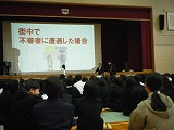 長年の経験をもとに、不審者対応の基礎から実践まで、分かりやすくご指導いただきました。 ■ 不審者対応避難訓練の様子今回は、昇降口付近に刃物を持った不審者が侵入したという設定で訓練を行いました。