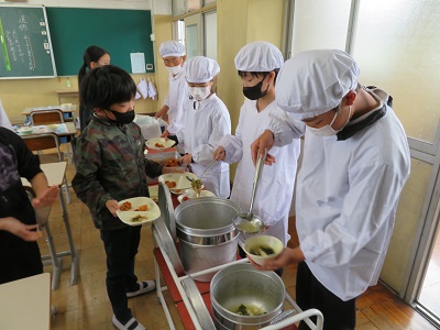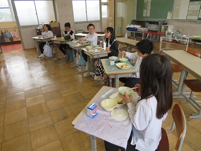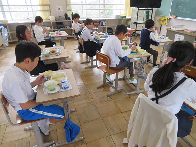 1年生以外は、今日から給食が始まりました。久し振りの配膳でしたが、給食当番の人たちが中心となり協力してできました。