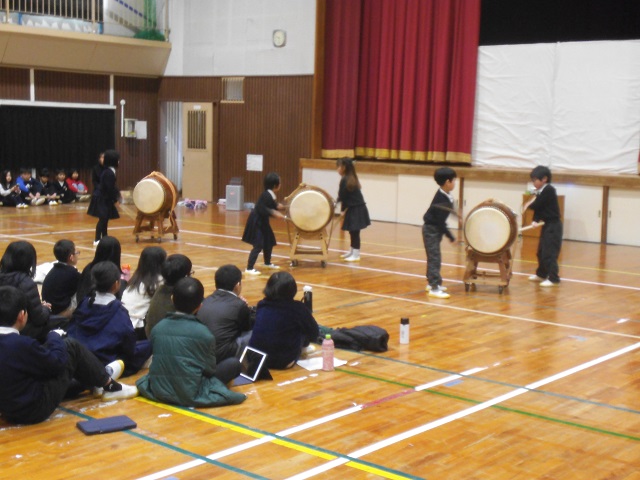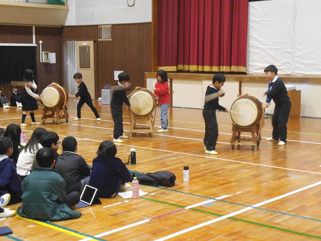 1,2年生は、仰木小唄・仰木太鼓についてのクイズをした後、実演しました。