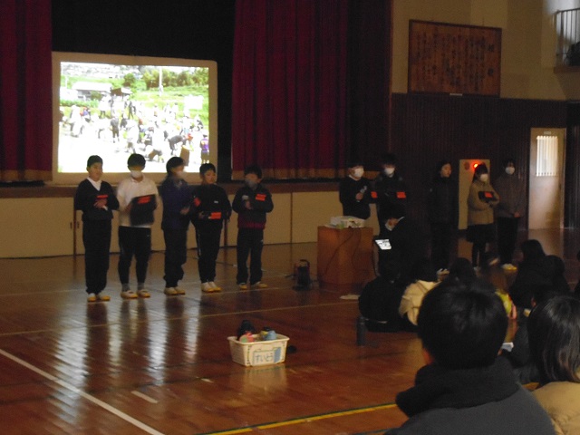 4年生は、2学期に学習した棚田学習と防災学習を関連付けて発表しました。5年生は、半年間全校の中心となって取り組んだ米作りをSDGsと関連付け、