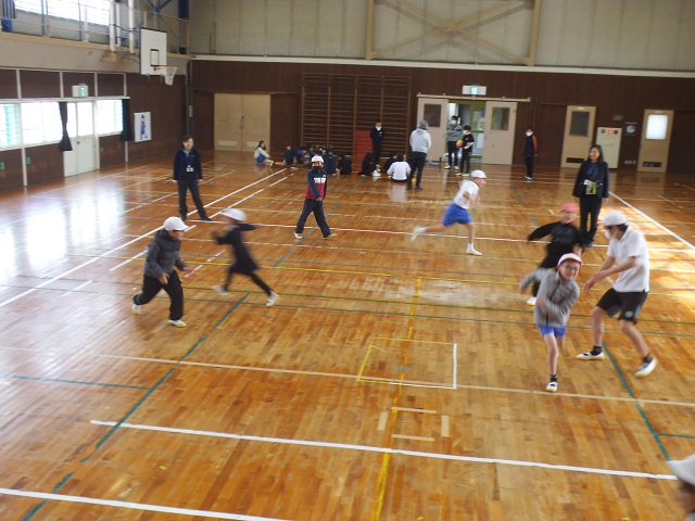 赤組は、前半各教室で宝探しや爆弾ゲームをし、後半体育館でドッジボールや氷おにを行いました。青組は、前半体育館でドッジボールやドッジビーをし、後半は各教室で宝探しや爆弾ゲームを行いました。