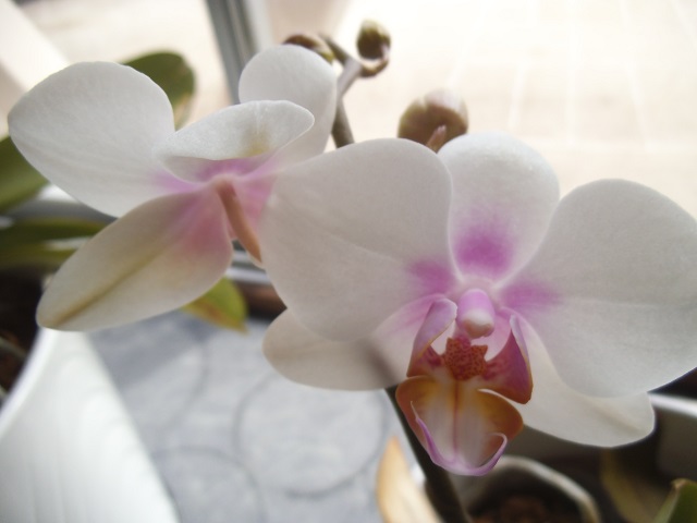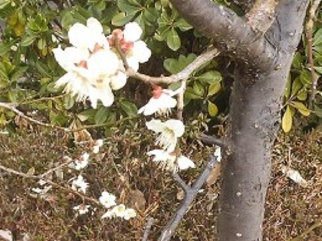 校庭の梅の花、玄関横のサクラソウ、校長室の胡蝶蘭