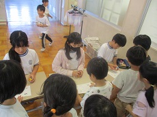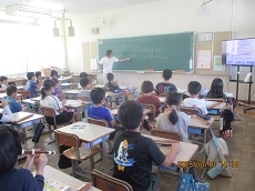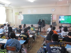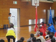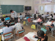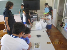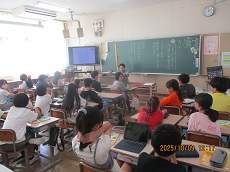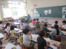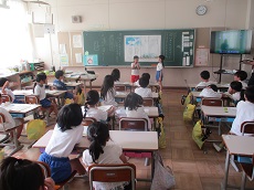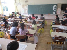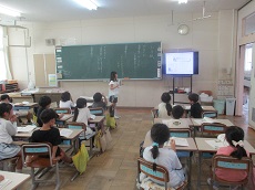 1枚目:1年生の国語科の様子です。「くじらぐも」の映画を撮影するために、「」(かぎ)の部分に気をつけながら、どんな演技をしたら良いかを考え、練習しています。動作もつけて、上手く演じられていました。撮影が楽しみですね。2枚目:ESDクラブの人たちが、1年生に配っておいた「せつやくカード」にスタンプを押しています。1年生は大喜びでした。電気や水のむだ使いを減らして、スタンプをためましょう。