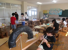 1枚目:5年生の算数科の様子です。分数の足し算の学習です。「通分して計算し、答えを約分する」その過程を、説明しています。上手く説明できていたので、納得している人が多いように感じました。2枚目:6年生の図画工作科の様子です。「白くなったら見える世界」と題して、白い紙の棒と様々なものを組み合わせて大きな立体を制作しています。多くの大作が完成しそうな予感があります。