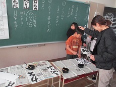 1枚目:2年生の国語科の様子です。書初めをしています。墨で書くのは、初めての人が多かったようですが、力強く大きく書けていました。素晴らしい。2枚目:1年生の体育科の様子です。音楽に合わせて楽しく動いています。じゃんけんの勝ち負けで、前につながったり後ろにつながったりします。一番長い列の先頭さんは、誰だったのでしょうか?
