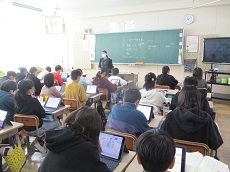 3枚目:5年生の国語科の様子です。友だちの意見文にコメントをつけています。タブレットの画面上で付箋をはるように、たくさんコメントがつけられていました。互いに良いところを見つけると、励みになりますね。