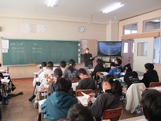 1枚目:図書委員の人たちが、朝学習の時間に、絵本の読み聞かせをしています。見やすいように、絵本をモニターに映す工夫を取り入れていました。2枚目:6年生の学級会の様子です。お楽しみ会の計画を立てていました。意見を全員で共有することを意識して進めていました。楽しい会にしてください。