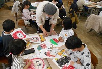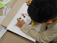 Leeecoさんからは、江戸時代に発展した「大津絵」について紹介していただき、さらにオリジナルのデザイン絵画を鑑賞した後、クレパスの色の塗り方や重ね方などを丁寧に教えていただきました。子どもたちは、鬼やダルマなどを自分なりに形や色を工夫しながら、ユーモラスな挿絵を仕上げていました。