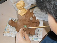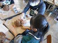 1月23日(金)、今年度も4年生を対象に、滋賀県立陶芸の森「つちっこプログラム」『願いを込めたタヌキをつくろう!』 を実施しました。当日は陶芸作家の先生方3名に来校いただき、信楽焼のタヌキづくりに挑戦しました。子どもたちは、事前に描いたオリジナルのタヌキの絵をもとに制作を進めました。まず、粘土をよくこねてから丸めた新聞紙を包み、だるまの形に整えて胴体をつくります。続いて、耳・目・口・手足・しっぽなどのパーツをつくり、水をつけながら丁寧に貼り付けました。最後に竹ペンで模様や表情を描き、色化粧泥を塗って完成です。乾燥した作品は陶芸の森で素焼き(1000度)していただきます。