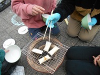 2/20(金)、四年生が社会科「昔の暮らし」の学習として、七輪を使った餅焼き体験を行いました。冷たい空気の中、子どもたちが向き合ったのは、炭にマッチで火をつけるという昔ながらの方法です。