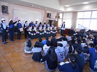 3/9(月)朝休み、民生児童委員の皆さんが12名お越しになり、卒業生に向けてハンドベル・コンサートをしてくださいました。曲目は、「小さな世界」「1年生になったら」「星に願いを」の3曲です。「1年生になったら」は、民生児童委員さんオリジナルの中学校入学バージョンです。