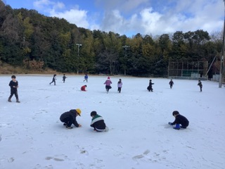 寒さに負けずに元気いっぱいの1年生です。体育の学習では、ランニングフェスティバルに向けて、3分間走にチャレンジしています。同じペースで長く走れるように、楽しくがんばっています。