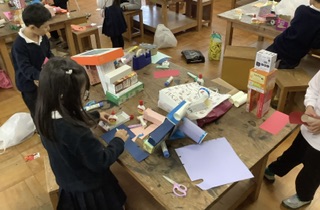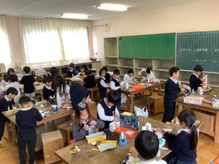 体育科の体ほぐしの運動では、いろいろなステップで音楽に合わせてリズムよく跳ぶ運動をしました。難しい動きも友達の動きを見て汗いっぱいでがんばりました。図画工作科では、はことはこを組み合わせて、好きなものを作りました。いろいろな楽しい作品が出来上がりました。