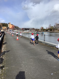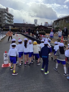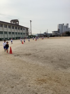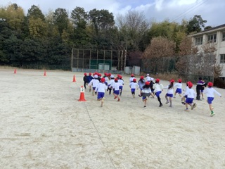 寒さに負けずに元気いっぱいの1年生です。体育の学習では、ランニングフェスティバルに向けて、3分間走にチャレンジしています。同じペースで長く走れるように、楽しくがんばっています。