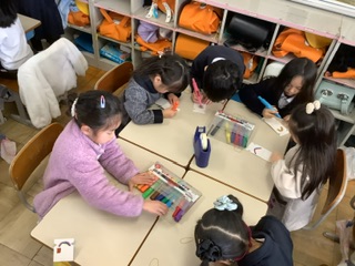 2年生のおもちゃランドに招待してもらいました。いろいろな遊びをいっぱい楽しみました。図工の時間は、グループでハサミでアートをしました。お互いの意見を聞き合うことを学びながら、楽しい作品が出来上がっていきました。