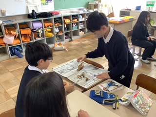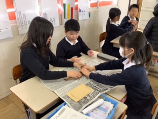今週行った3つの学習を紹介します。1つ目は総合学習「森林学習」。やまのこで作った焼杉の板に続いて、同じ間伐材の小さな無垢の杉板を、やすりを使って磨きました。熱中して磨くうちに表面がつるつるすべすべに。木材の持つ独特の質感や温かさを感じることができました。