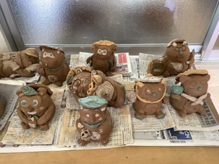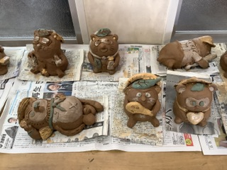 信楽陶芸の森から、4人の陶芸家さんたちにお越しいただき、卒業制作として信楽焼のたぬきを作りました😊事前学習として、信楽焼のたぬきには八つの縁起物があることを知り、それぞれの意味を調べるところから学習を始めました。そして、オリジナルのたぬき作り(デザイン)をしました。当日は、2時間という限られた時間の中ではありましたが、集中して作業に取りかかっていました。陶芸家さんたちも、みんなの姿にびっくりしておられました✨️すごい集中力!!と😆