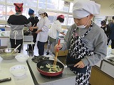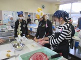 今日は「炒める」学習として、「ジャーマンポテト」を作りました。まず初めに、包丁を使ってじゃがいもの皮むきをするのですが、普段包丁を使わない子どもたちにとっては、緊張しながらの作業となりました。使い慣れている子にコツを教えてもらいながら、なんとか皮むきを終えることができ、ホッとする子どもたち。その後、玉ねぎやベーコンを習った形に切り分けながら、手早く材料を炒め、美味しそうな「ジャーマンポテト」に仕上げることができました。ぜひおうちでも作ってほしいです。