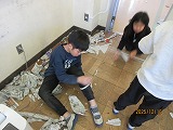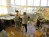 図工室いっぱいに新聞紙を広げて、たっぷり時間を使って活動しました。ぺらぺら、しゃかしゃか、うすくてやわらかく、しなやかな「新聞紙」という素材の特徴を活かして、「やぶる」「ちぎる」「くしゃくしゃにする」「丸める」「穴をあける」「ねじる」などの変化をさせて遊ぶ学習です。服や帽子、冠、盾、剣などを作って身にまとい「勇者」のような変装をしたり、隠れ家のような家をつくり中へ入って遊んだり、布団や枕を並べた「ベッド」で寝たり、細かく破った新聞紙をたくさん集めてふわふわのところにうずくまったり・・・それぞれに思う存分、新聞紙まみれになって楽しみました。この活動にあたってたくさんの新聞紙をご協力いただきありがとうございました。おかげで子どもたちがたっぷりと活動にひたることができました。