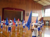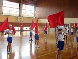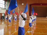 今日は高学年が体育館で団体競技「フラッグ」の練習を始めました。暑い中にもかかわらず、真剣な眼差しで技を練習する子どもたち。「バシッ!」というフラッグの切り返しの音を出すためのコツや目線の大切さを教わりながら、くり返し練習をしていました。下学年から憧れられる演技を目指して、全力で頑張ってほしいと思います。