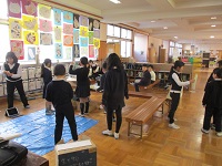 1年生は、今日はB組が冬休みの宿題の話を聞いていました。先生から配られたものを封筒に入れました。2年生は、「お楽しみ会」をしていました。みんなでゲームを楽しみました。3年生は、お楽しみ会の準備をしていました。中学年になると、みんなで楽しめるように工夫する姿が見られます。