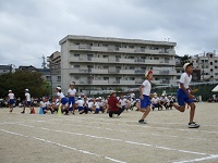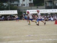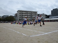 | 2025/10/18 運動会7 6年生による小学校生活最後のリレーです。仲間を信じ、トップスピードにのったバトンパスをする姿が、かっこよかったです。さすが6年生です。 |