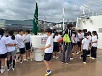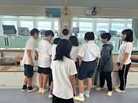| 2025/09/26 フローティングスクール4 船内見学の様子です。普段は入れない操舵室にも今日は特別に入れていただきました。 |