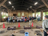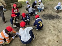 | 2025/09/19 やまのこ体験学習8 森林学習(焼杉)の活動に入っています。写真は焼杉の説明を聞いているところです。どんな杉板ができあがるか楽しみです。 |