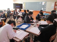 | 2026/01/26 今日の学習の様子(わかば・4・5年) 交流学級でもみんなと一緒に百人一首に取り組んでいるわかばの子供たちですが、わかば学級でも腕を磨いています。先生と対戦することもあります。4年生は、ジョイス先生と一緒に外国語活動を楽しみました。アルファベットの発音を学びました。元気のよい声で発音することができました。5年生は、算数科「およその面積を求めよう」の学習です。四角形でも三角形でもない形の面積を見当をつけながら求めました。 |