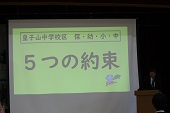 OSK会議とは、O・・皇子山中学区、S・・小中学生、K・・子ども 会議の略称です。今日は、学区の4小学校の児童会のメンバーと本校の生徒会が、皇子山中学校に集まってテ「いじめ防止 人権意識の向上」というテーマで話し合いをしました。