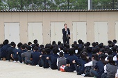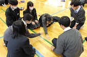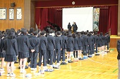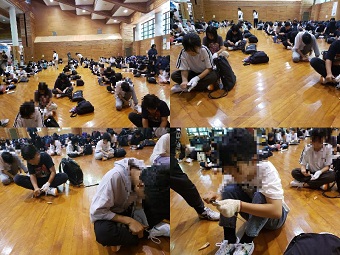 今回は、大津市中消防署より3名の署員さんに来ていただき、指導・助言いただきましたが、子ども達は非常に静かに避難が出来ていたとお褒めいただきました。いつ、どこで起こるかわからないので色々な想定をしておいてほしいこと、中学生は助けられる立場から助ける・気遣える立場に変わってきていることを意識してもらって、万が一の時は行動してほしいです。とお話がありました。