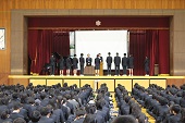 春季総体における表彰伝達を行いました。サッカー部・水泳部・柔道部など優秀な成績をおさめた部の代表が壇上で学校長より賞状を受け取り、生徒のみなさんに披露されました。少し照れているようにも見えましたが、皇子山中学校の代表としてとても誇らしい姿でした。他にも多数の表彰があり、全校生徒で称え合いました。
