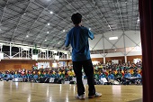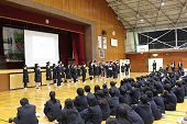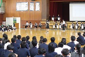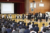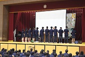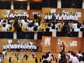 数年ぶりに体育館に集まっての部活動壮行会です。昨年までは、感染症予防のため各教室でオンラインでの壮行会でした。