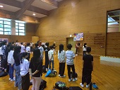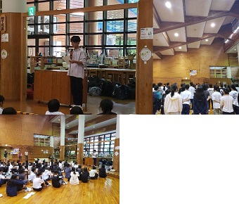 1年生は、明日よりふるさと体験学習です。事前集会では、まずスローガンの発表がありました。「楽しめ!! 笑顔で!! 自然に飛び込め!!!~忘れられない思い出を~」。自然の中で笑顔いっぱいの体験ができるといいですね。実行委員長からは、「いいスタートをきるために、みんなの協力が必要です。みんなで協力して楽しいふるさと体験学習にしましょう。」とみんなに呼びかけました。持ち物や明日の行動の最終確認も行いました。