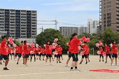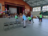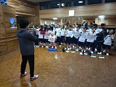 今日は、全7団中、3団(団:各学年1クラスずつで構成)が行いました。最初は不安そうにインストラクターの話を聞いていましたが、ダンスが始まるとみんなリラックスし活動していました。跳んで、回って、ハイタッチ、インストラクターの振付を真似して音楽に合わせてリズムをとったり、ラインに沿っていろいろなジャンプをしたり、みんな楽しくリズムダンスを行いました。