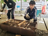 命の学習の時間。あまごを手で掴み、気絶させて作った串をさします。