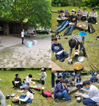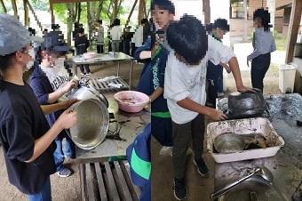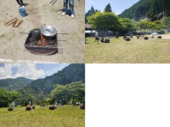 野外炊事の準備中。おいしいご飯が炊けるかな。