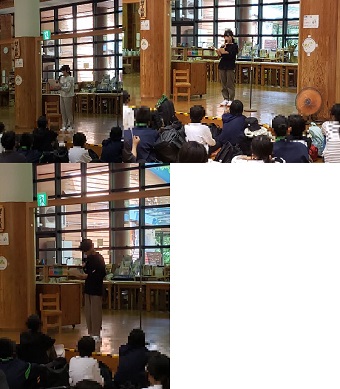 学校給食課の楽食プロモーターの方に「地産地消」についての授業をしていただきました。この地産地消の考え方には、「新鮮でおいしい食材が手に入る」、「輸送にかかるエネルギーが少なく、環境にやさしい」、「地元の農家さんや漁師さんを応援できる」などのメリットがあることを知りました。また、滋賀県の郷土料理や特産物について自分で調べ、みんなで紹介し合いました。じゅんじゅん、赤こんにゃく煮、湖魚のてんぷらなど、給食にも出てくる郷土料理などが紹介され、滋賀ならではの食文化にふれることができました。最後に、これからも地元の食材や料理にもっと目を向けて、食べることの大切さを考えてくださいとお話がありました。