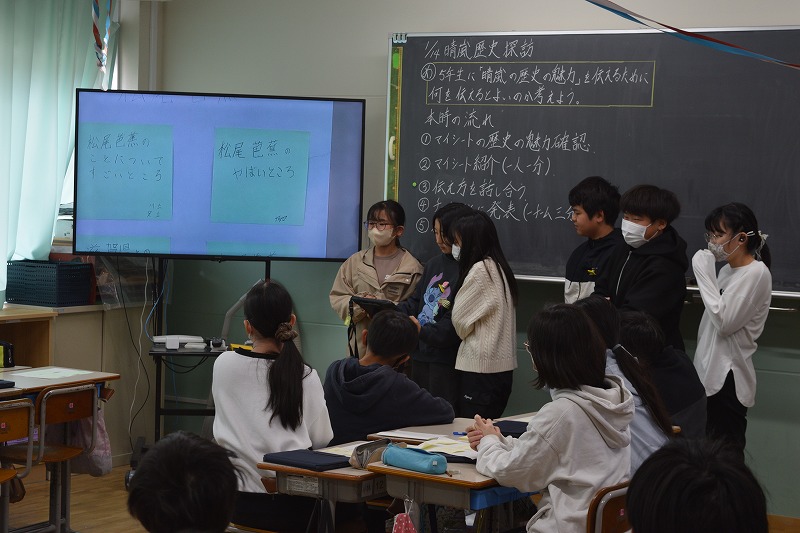 5年生に「晴嵐の歴史の魅力」を伝えることをめあてに活動に取り組みました。どこにスポットを当て、どんな伝え方をすると興味を持ってもらえるか、アイデアを出し合いました。