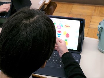 若草学級のひとコマです。「ぼくのわたしのステキ図鑑をつくろう」と題して、好きな季節や食べ物などをタブレットを用いて表していきます。