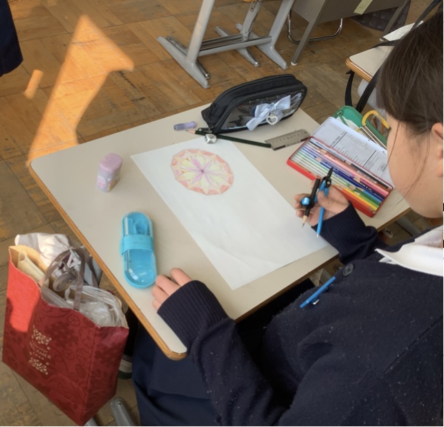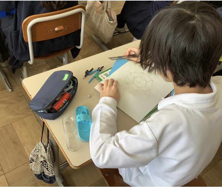 5年生の算数科の学習では、円と多角形の内容に取り組んでいます。分度器やコンパスなどを用いて、正六角形や正八角形の描き方を学びました。今回は、その学んだことを活かし、オリジナルの模様づくりの活動を行いました。