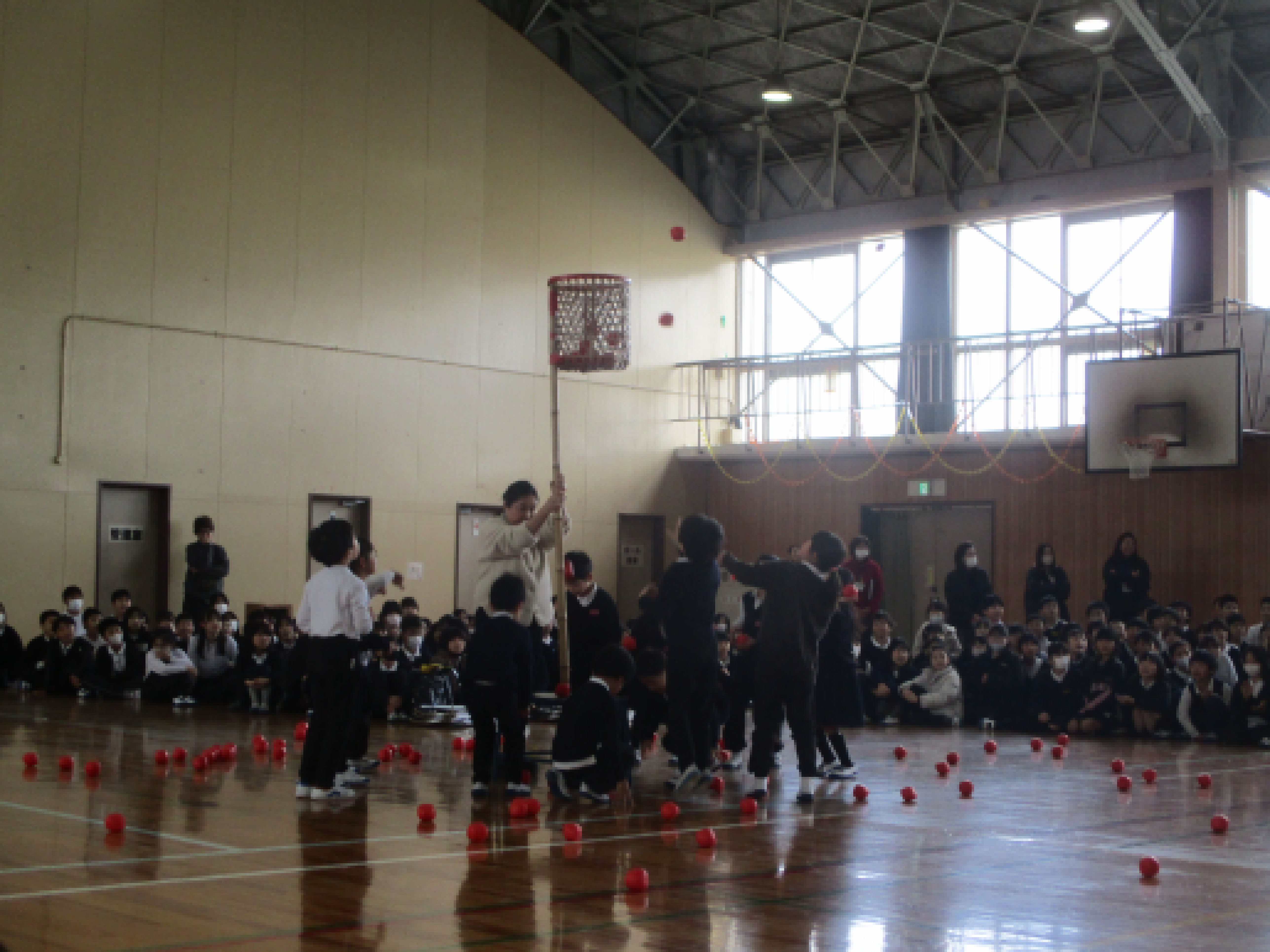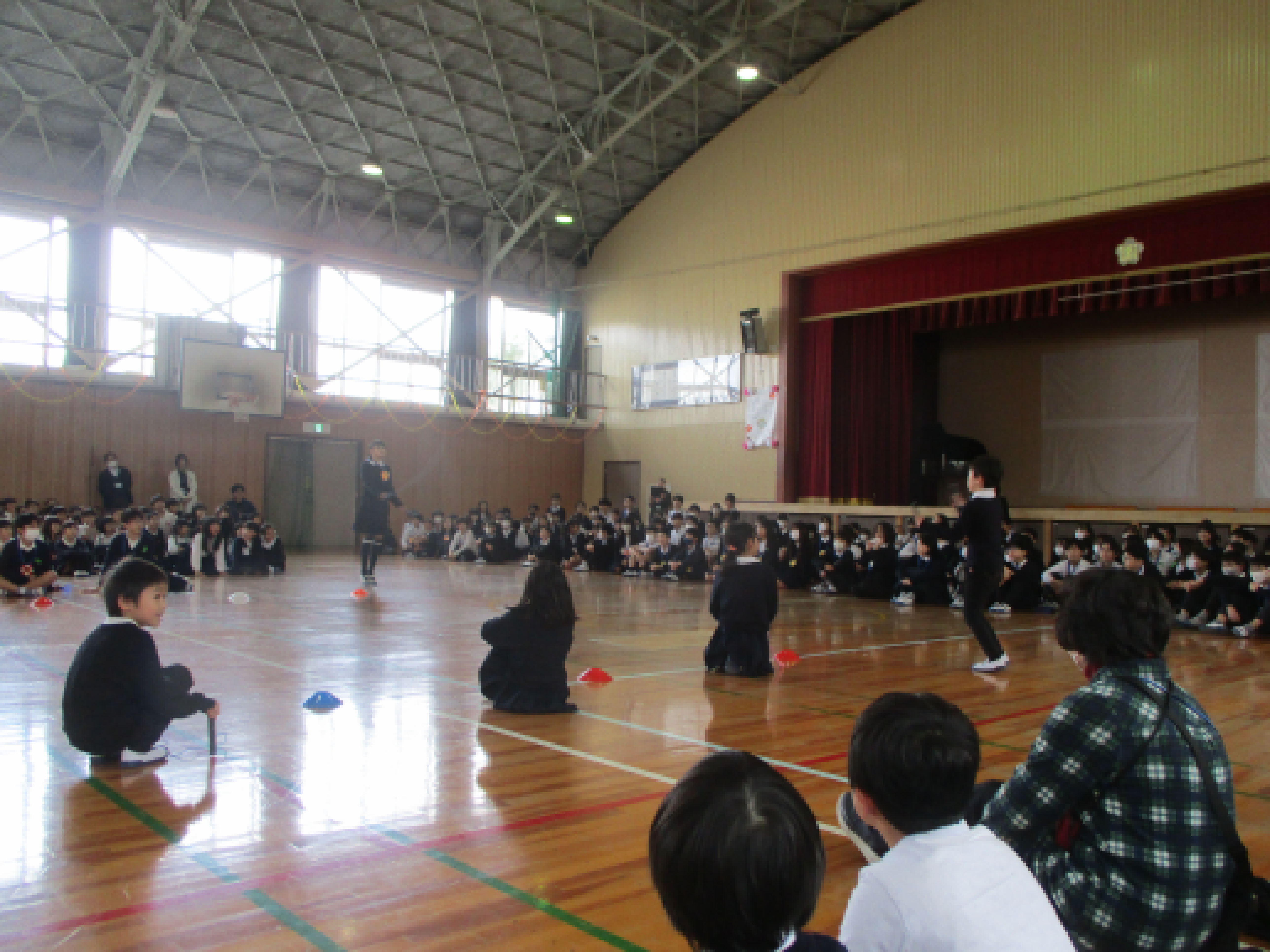 今日は6年生を送る会でした。1年生の出し物は、日ごろから掃除やたてわりなどでお世話になっている大好きな6年生の胸を借りて「6年生に挑戦!」です。縄跳びのあやとびと玉入れの2種目を6年生と対決しました。会場は大盛り上がり!とても良い時間を過ごせました。ありがとうの気持ち、伝わっているといいね。