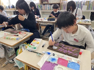 やまのこで、心を込めて磨き上げた「焼き杉」にデザインをしました。みんな、目を輝かせながら思い思いのデザインを描きました。
