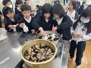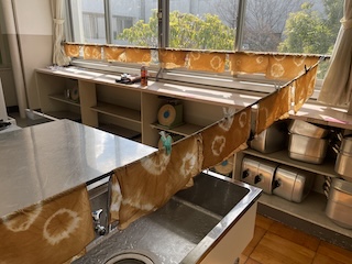 やまのこで、雪遊びができなかった時のためにする予定であった「草木染め」を学校で行いました。落ち葉拾いからスタートし、煮出し、煮込み、媒染、乾燥を行いました。