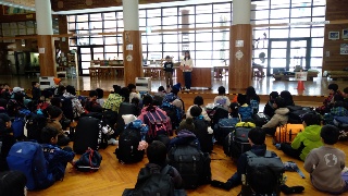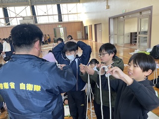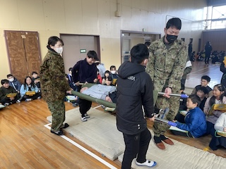 社会科と総合的な学習で勉強している「防災教育」の一環で、自衛隊の方に出前授業に来ていただきました。自衛隊の方から、防災で大切なことや自衛隊のお仕事について教えていただきました。
