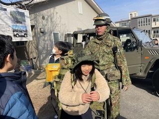 また、自衛隊車両に乗せていただいたり、重たいリュックを担がせてもらったりしました。