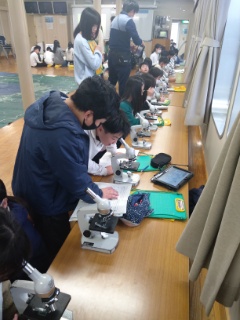 今津港で採水しました。顕微鏡やデジタル顕微鏡でミジンコやミクラステリアスハーディ、オビケイソウなどたくさんのプランクトンを見つけました。ブルーギルやブラックバス、ニゴロブナやゲンゴロウブナなど、外来種や在来種の違いについても学びました。