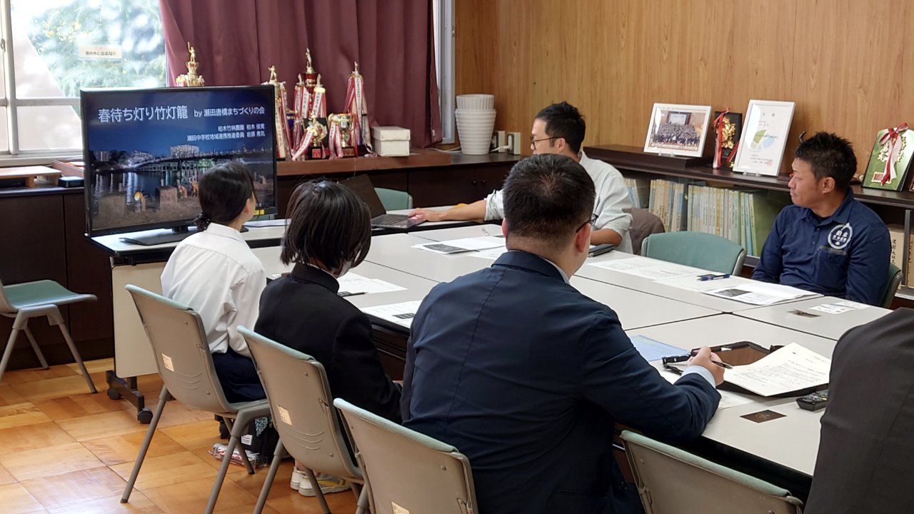 大津市では、生徒の「やってみたい!」という気持ちを大切にし、学校・地域・企業が一体となってその夢を応援する取り組み「学校夢づくりプロジェクト」が進められています。このプロジェクトの主役は、もちろん生徒自身。自分たちでアイデアを出し、企画を立て、地域の方々や企業と協力しながら、夢を形にしていきます。 今年度は、瀬田中学校の生徒会が「瀬田唐橋まちづくりの会」とコラボレーションし、「春待ち灯り竹灯籠」イベントに参加することになりました。 本日は、「瀬田唐橋まちづくりの会」から岩原さんと柏木さんをお招きし、新生徒会長の鷹野原さん、副会長の山本さんとともに、会の活動内容や「春待ち灯り竹灯籠」について学びました。 地域の方々から直接お話を伺うことで、子どもたちは「まちづくり」や「地域の魅力」に対する理解を深めることができました。これからの活動がますます楽しみです! 生徒の夢が地域の力と結びついて輝く瞬間を、これからも応援していきたいと思います。
