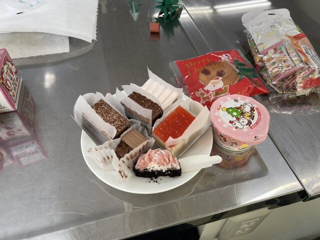 給食は、ただ食べるだけの時間ではありません。子どもたちが仲間と過ごし、食を通じて学ぶ大切な場です。今回は、保護者の皆さんにも生徒と同じメニューを配膳し、実際に食べていただきました。 私個人としては、鯖が一切れ余っていたので2切れいただきましたが、焼き加減が抜群でノルウェー産の鯖の脂ののりも最高でした。 食べていただいた後は、生徒の配膳と食べている様子を見ていただきました。そのあと、給食にたまーに出るデザートを業者さんにたくさんご提供いただいたので、デザートバイキングの試食タイム!みなさん、ケーキは別腹!のご様子で、調理室は和やかな雰囲気に包まれました。